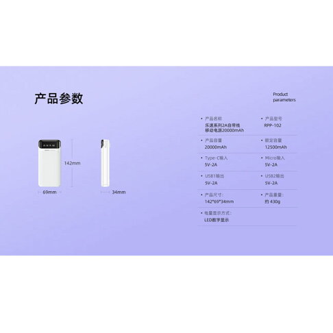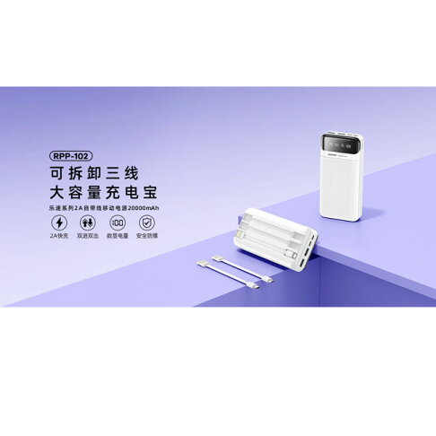 > Remax 自帶線 20000mah 行動電源 可拆卸充電線 雙USB輸出